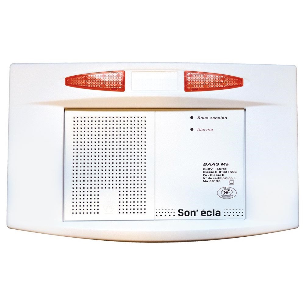 Boîtier ABS. IP 30 – IK 03. 1 boucle de DM (30 maxi). Livré avec batteries. 1 relais pour asservissements